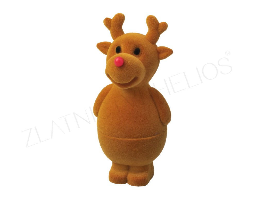 Hnědá sametová krabička ve tvaru vánočního soba na prsten nebo menší náušnice.