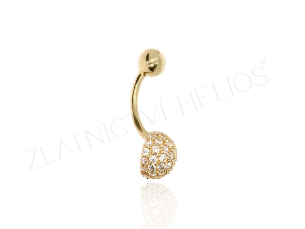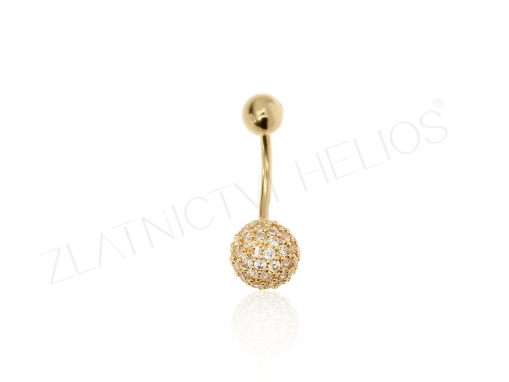 Zlatý piercing do pupíku ozdoben kuličkou se zirkony. Má velmi jedinečný a jednoduchý design.