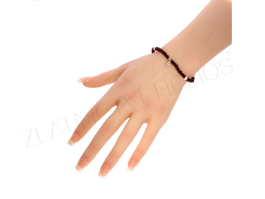Náramek s českými granáty, perličkami a drobnou stříbrnou ozdobou navlečenými na silikonu, který zajistí příjemné nošení na různých velikostech zápěstí.