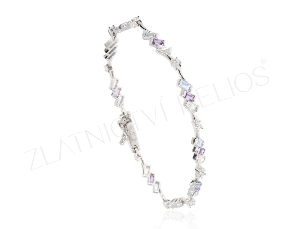 Náramek z bílého zlata zdoben světle fialovými, modrými a bílými zirkony.