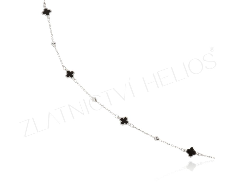 Jemný zlatý náramek s čtyřlístky, které mají černý střed. Náramek z bílého zlata.