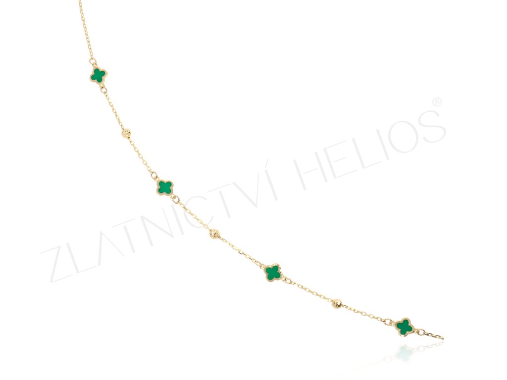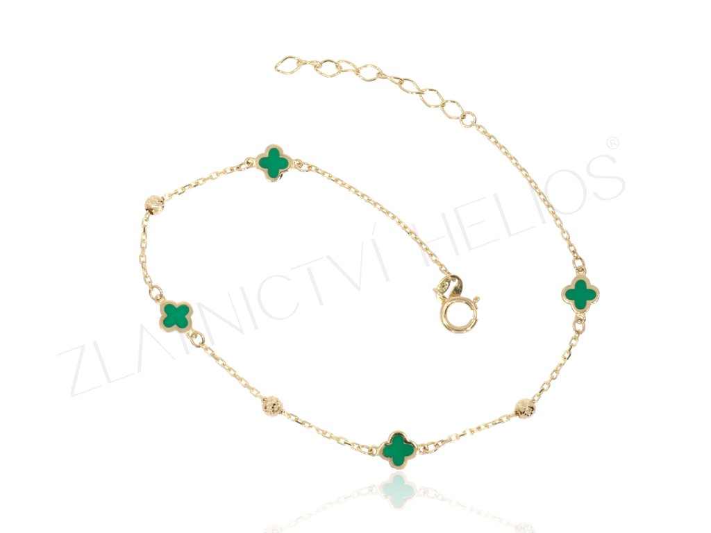 Náramek ze žlutého zlata se čtyřlístky, které mají zelený střed. Módní provedení, dárek pro ženy, které sledují trendy.