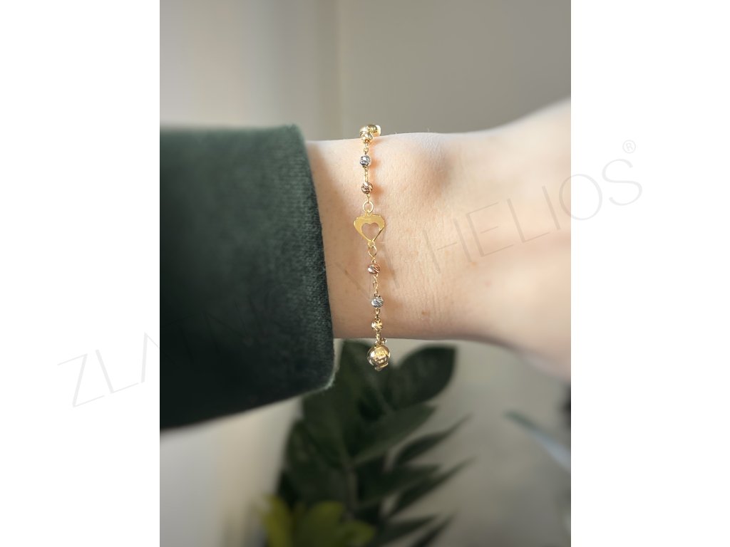 Droboučké kuličky ze žlutého, růžového a bílého zlata jsou proloženy srdíčkem a tvoří tak náramek z kombinovaného zlata. Symbol srdce je zde v lesklém provedení. Délku náramku si můžete přizpůsobit v rozmezí 15-17cm. Rozměr 15-17cm je na velmi štíhlou ruku.