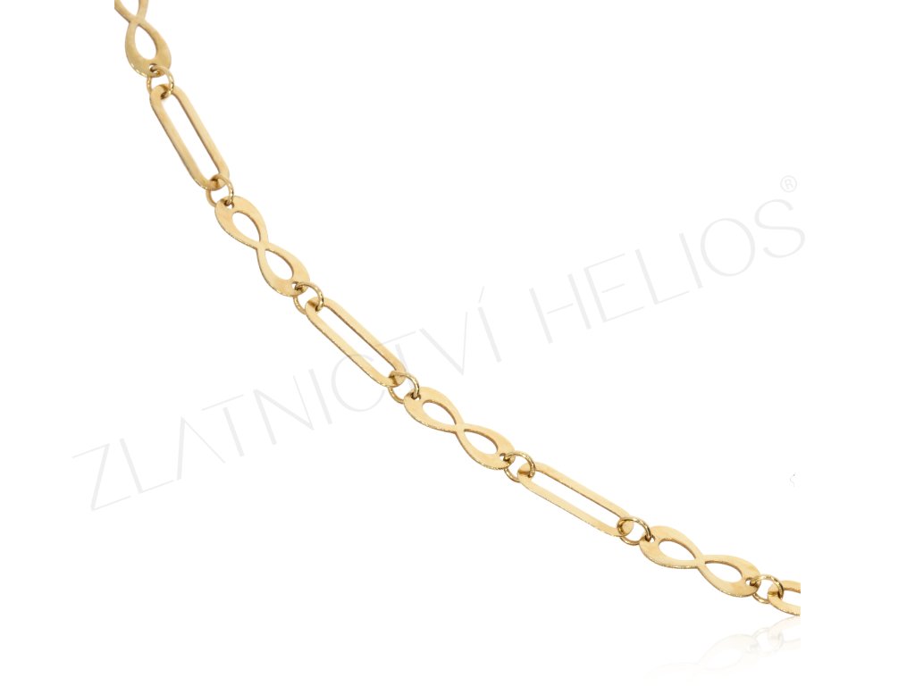Náramek ze žlutého zlata, které tvoří obdélníčky a nekonečno. Jemný, decentní šperk s oblíbeným symbolem Nekonečno.