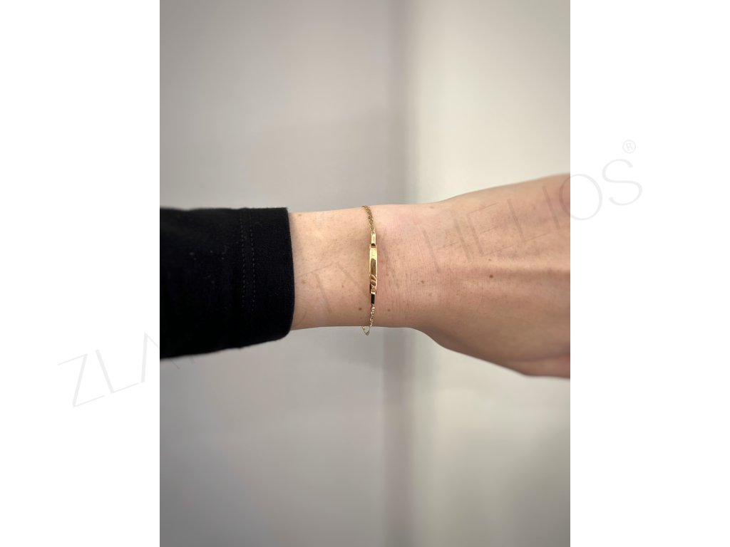 Náramek ze žlutého zlata s destičkou. Náramek je vhodný pro děti, nebo ženy s drobným zápěstím. Na destičku je možno doplnit i oboustranné rytí, kratší nápis, nebo monogram....