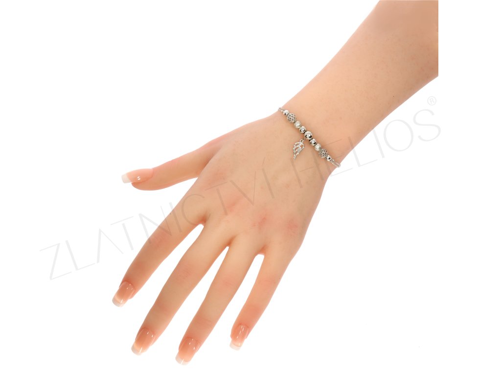 Krásný náramek vyrobený ze stříbra zdobený kuličkami, které dodají náramku šmrnc a lesk. Uprostřed náramku je hlavní přívěšek andělské křídlo.