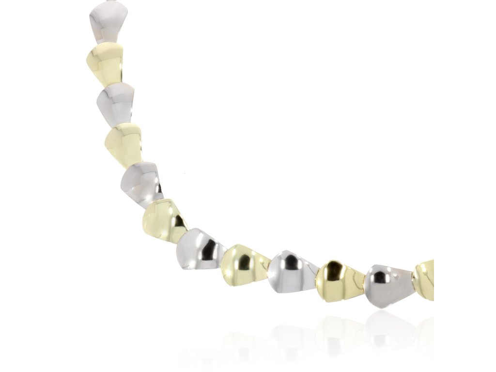 Lesk žlutého a bílého zlata se střídá na ploškách tohoto náramku. Náramek je opatřen karabinou.