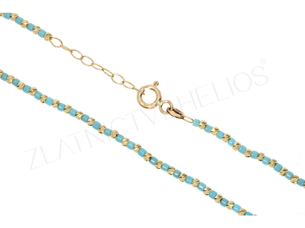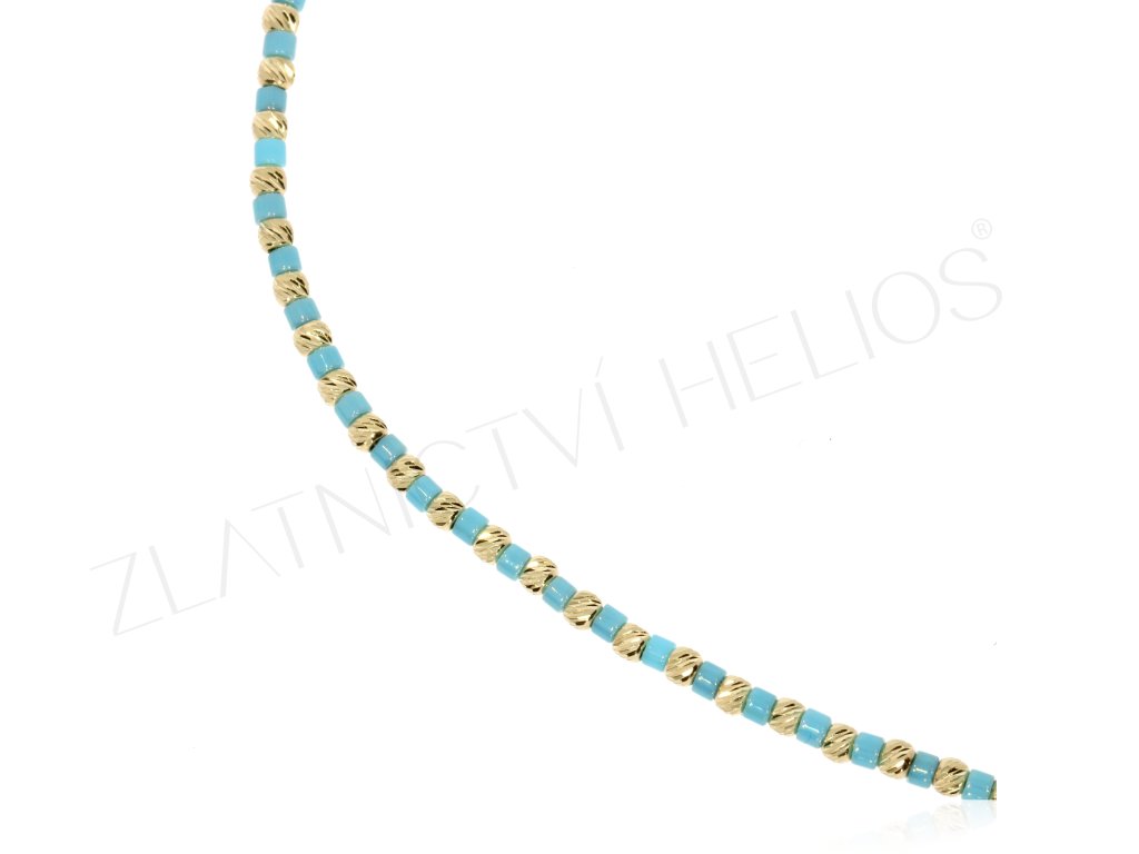 Zlatý náramek zdobený drobnými tyrkysovými kuličkami, které dodávají šperku jemnost a jedinečnost.