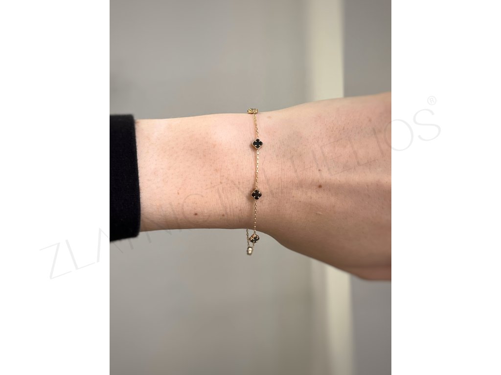 Náramek ze žlutého zlata s čtyřlístky, které mají černý střed. Módní provedení, dárek pro ženy, které sledují trendy.