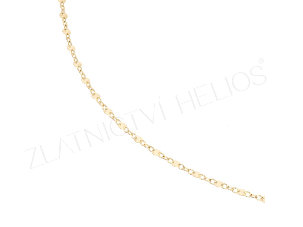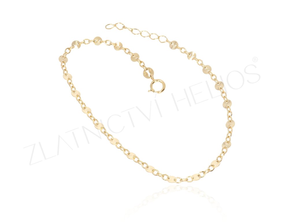 Droboučké placičky ze žlutého zlata jsou vloženy mezi očky náramku ze žlutého zlata. Tento třpytivý náramek je vhodný pro ženy i dívky.