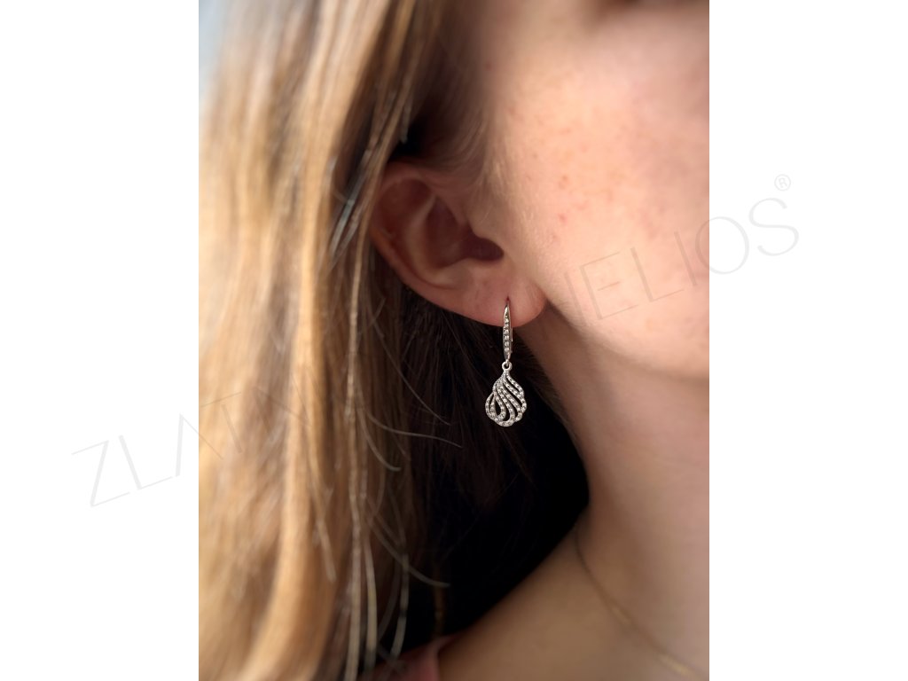 Visací zlaté náušnice jsou zdobené zirkony i na vrchní části, kde je pohodlný patent.
