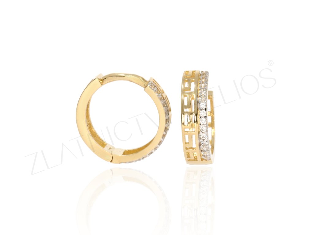 Náušnice kroužky ze žlutého zlata se zirkony a řeckým motivem.