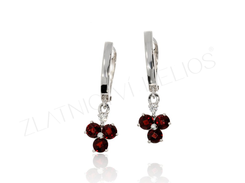 Zlaté visací náušnice, kterým vévodí granáty nad nimiž jsou drobné diamanty. Náušnice z bílého zlata na francouzské zapínání.