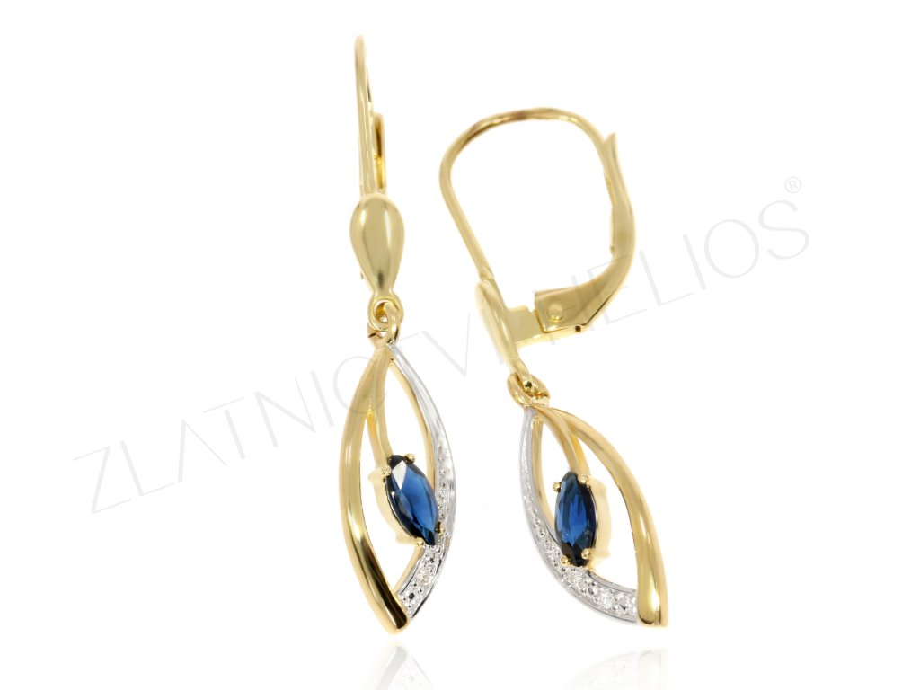 Visací náušnice ze žlutého zlata má elegantní tvar, z jedné strany je zdoben drobnými čirými diamanty. Uprostřed je zasazen broušený safír ve tvaru markýzy, který který tvoří dominantu šperku.