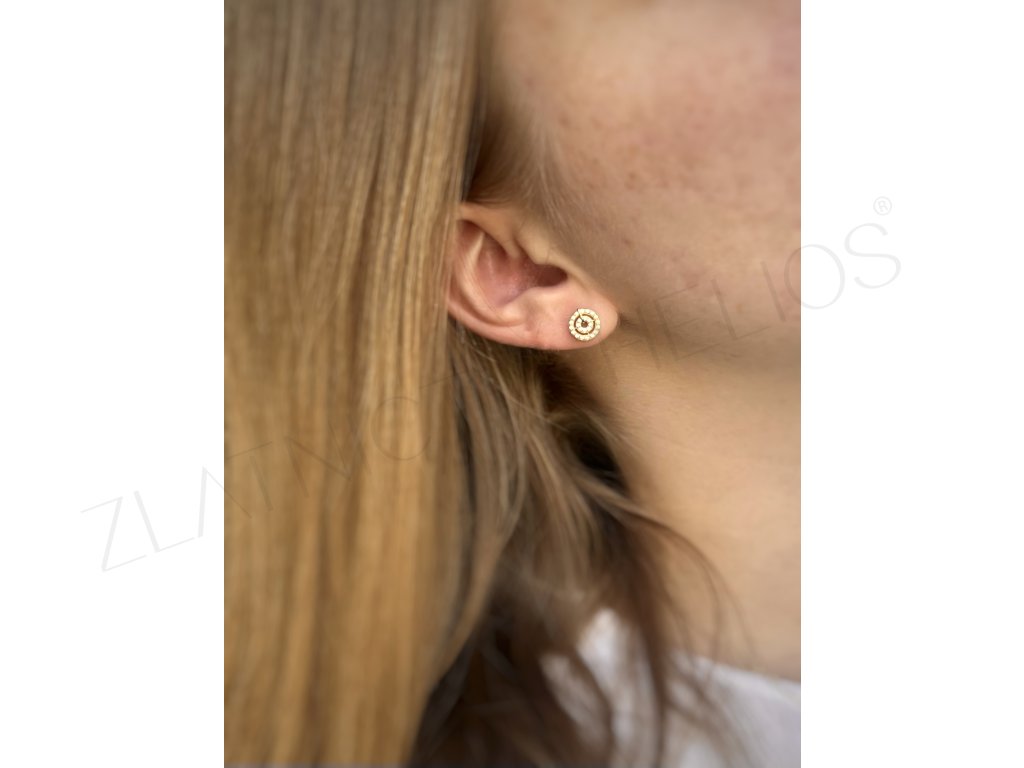 Dva kroužky na každé zlaté náušnici zdobené zirkony. Zapínání na bezpečný šroubek.