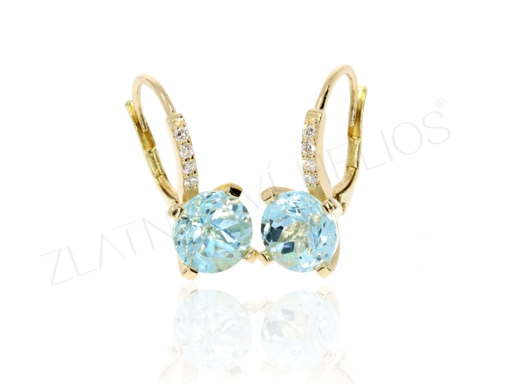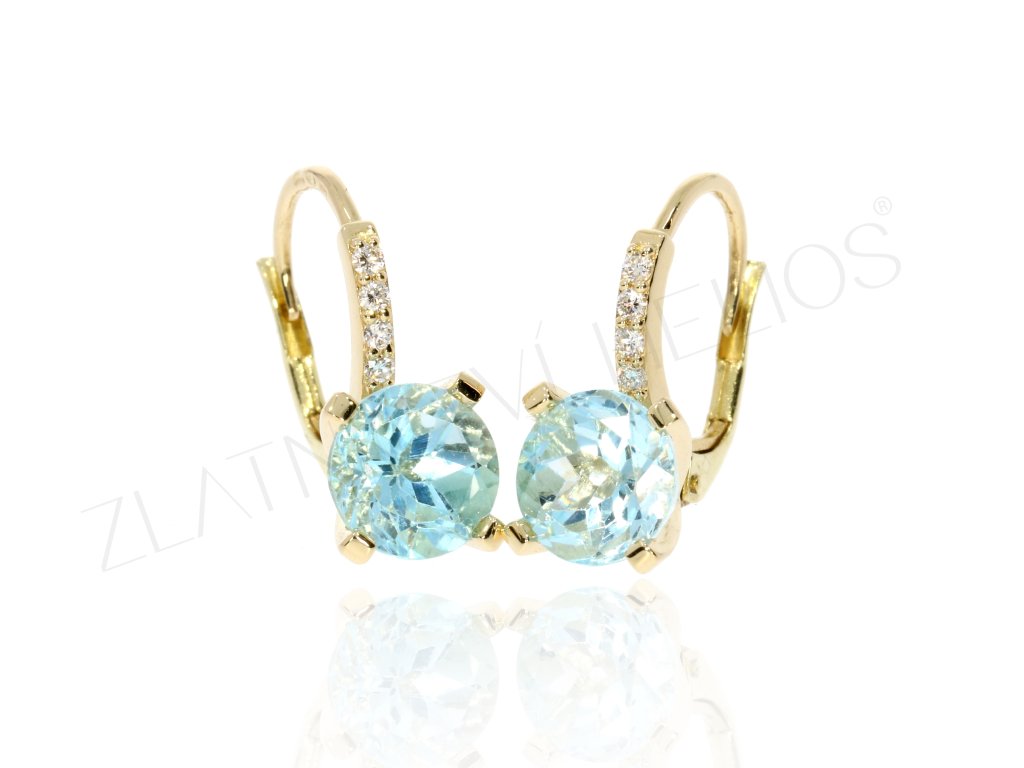 Náušnice ze žlutého zlata zdobené diamanty a Swiss Topazy. Precizní provedení těchto náušnic spolu s drahými kameny vytváří nepřehlédnutelný šperk.