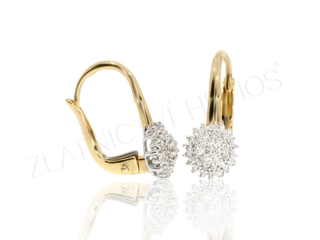 Náušnice ze žlutého zlata s klasickým patentem, zdobené diamanty s briliantovým výbrusem. Nadčasový design, pohodlná manipulace a nošení- náušnice jsou vhodné ke každodennímu nošení.