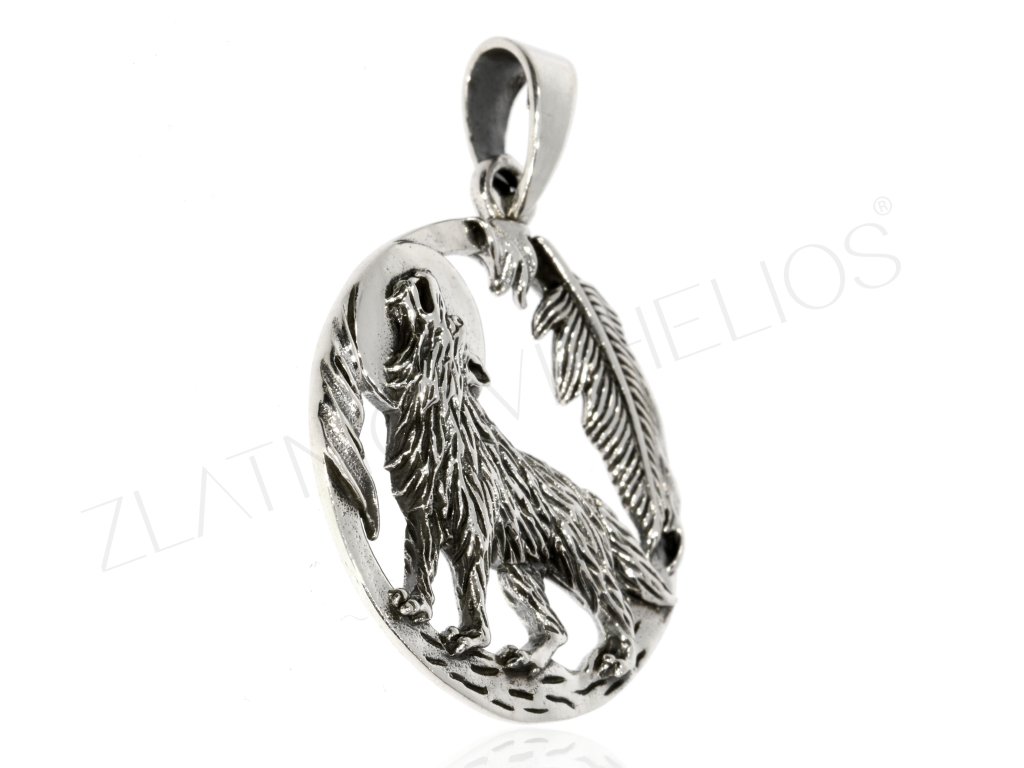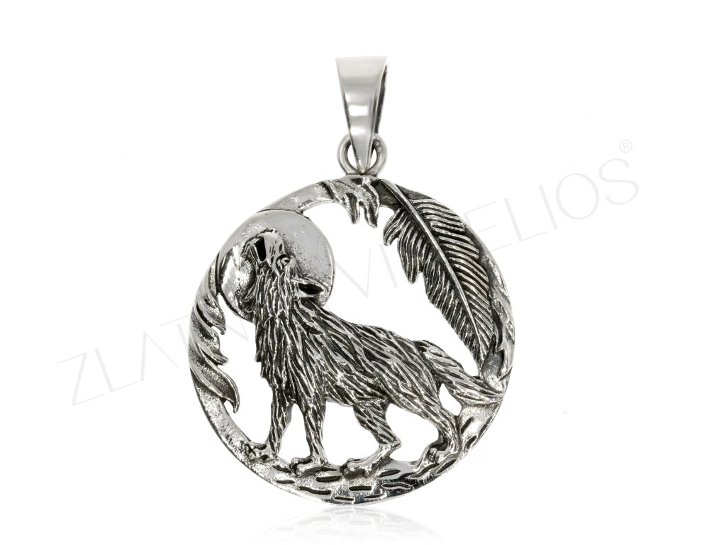 Stříbrný medailon s vyjícím vlkem, přívěsek v patinovaném provedení.