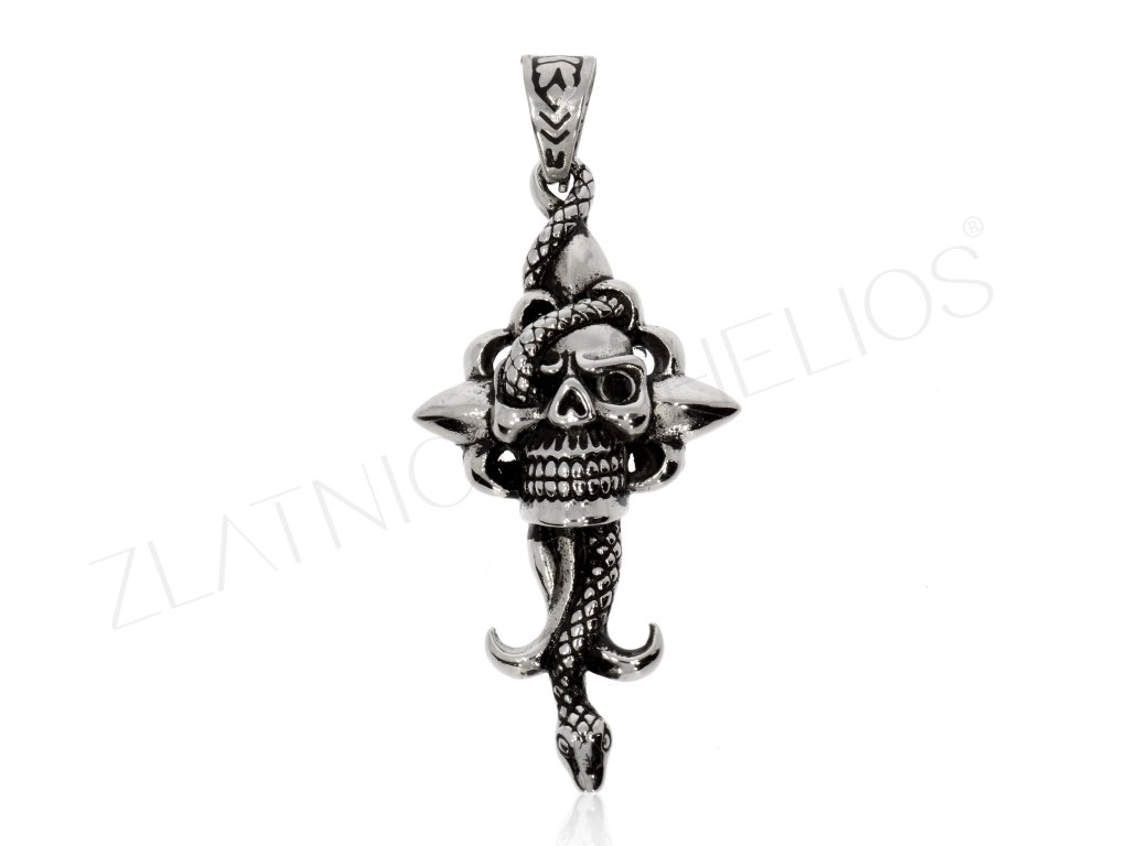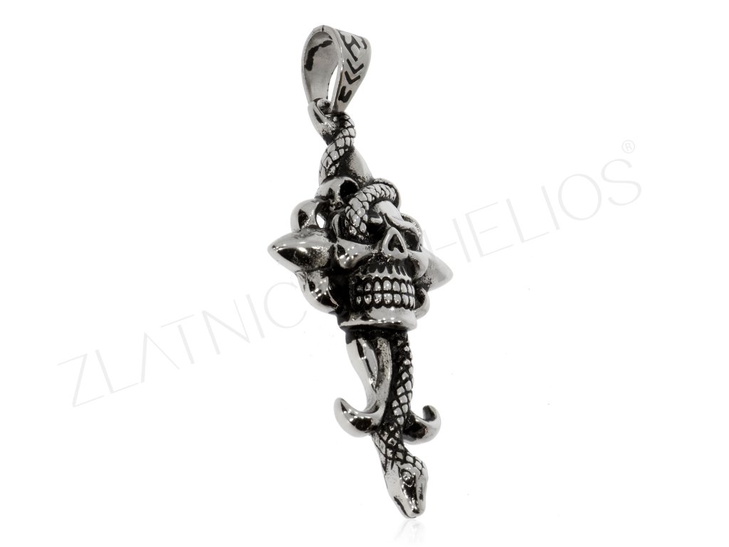 Přívěsek z chirurgické oceli pro motorkáře- lebka na kříži je obtáčena hadem.