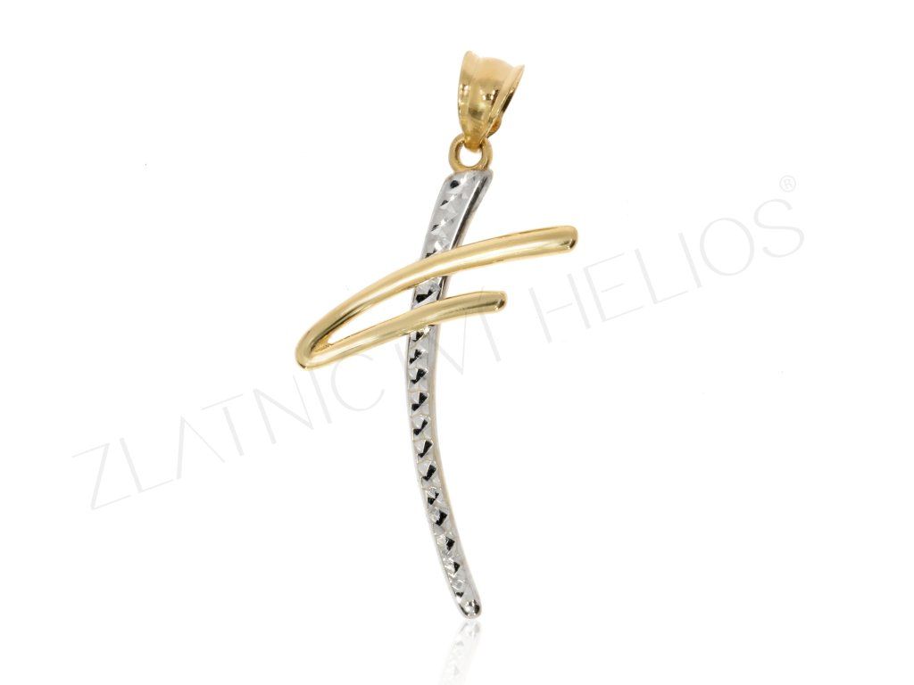 Netradiční provedení přívěsku ze zlata. Kříž je prohnutý, asymetrický, zdobený rytinou v rhodiované části, která upoutá svým leskem.