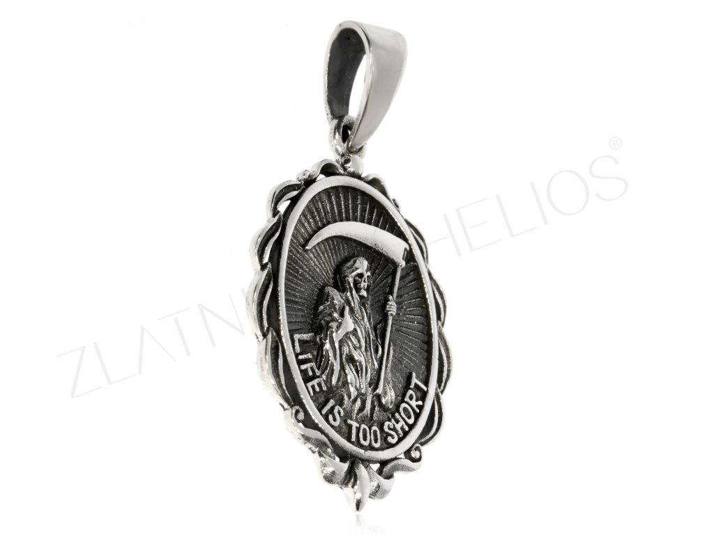 Patinovaný medailon ze stříbra s motivem smrtky v kápi s kosou.