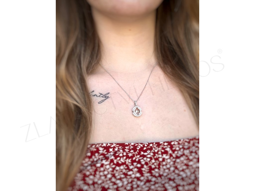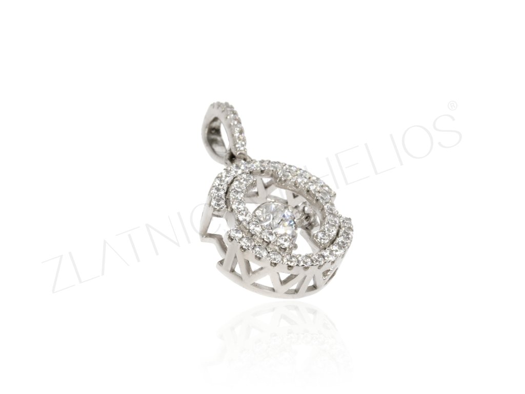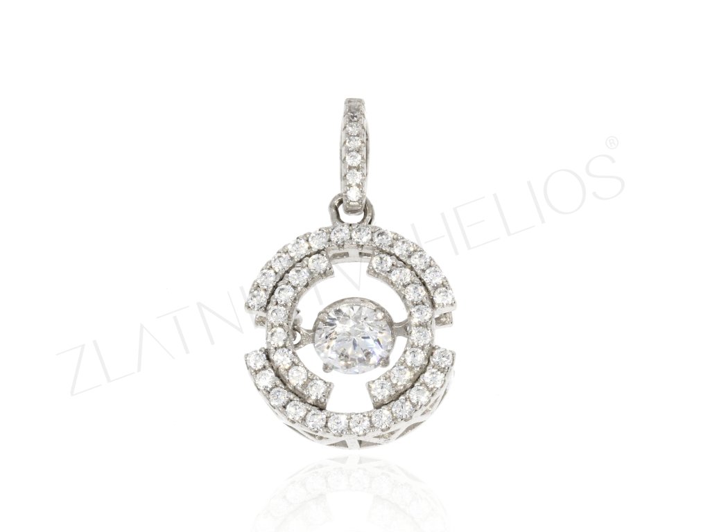 Třpytivý stříbrný přívěsek s drobnými zirkony. Centrální zirkon je pohyblivý.