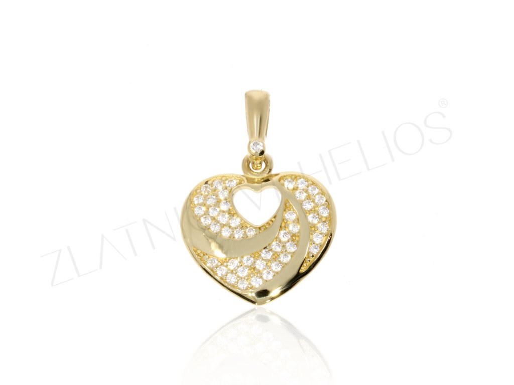 Přívěsek ze žlutého zlata. Srdce zdobené vírem zirkonů obtékajícím malé prořezané srdíčko.