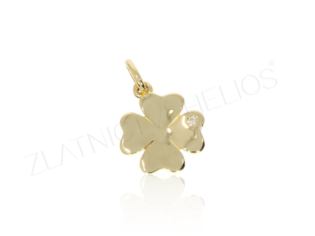Lesklý zlatý čtyřlístek zdobený jedním diamantem. Přívěsek pro ženy, muže i děti.