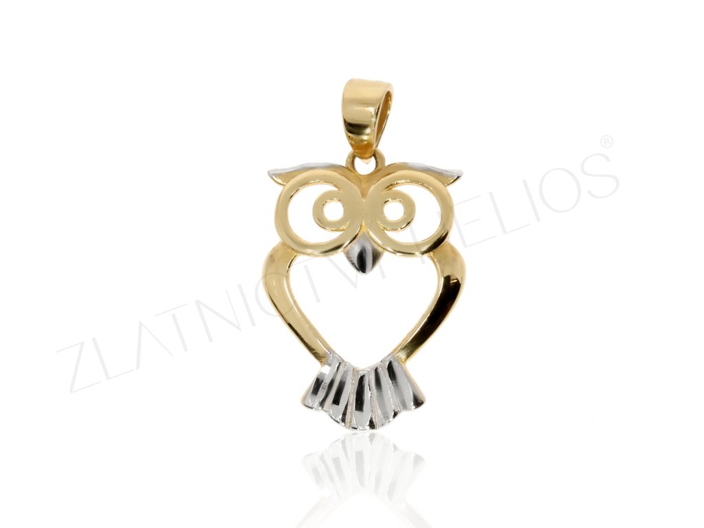 Přívěsek zlatá sova. Vyroben ze žlutého zlata a zdobený rhodiem.