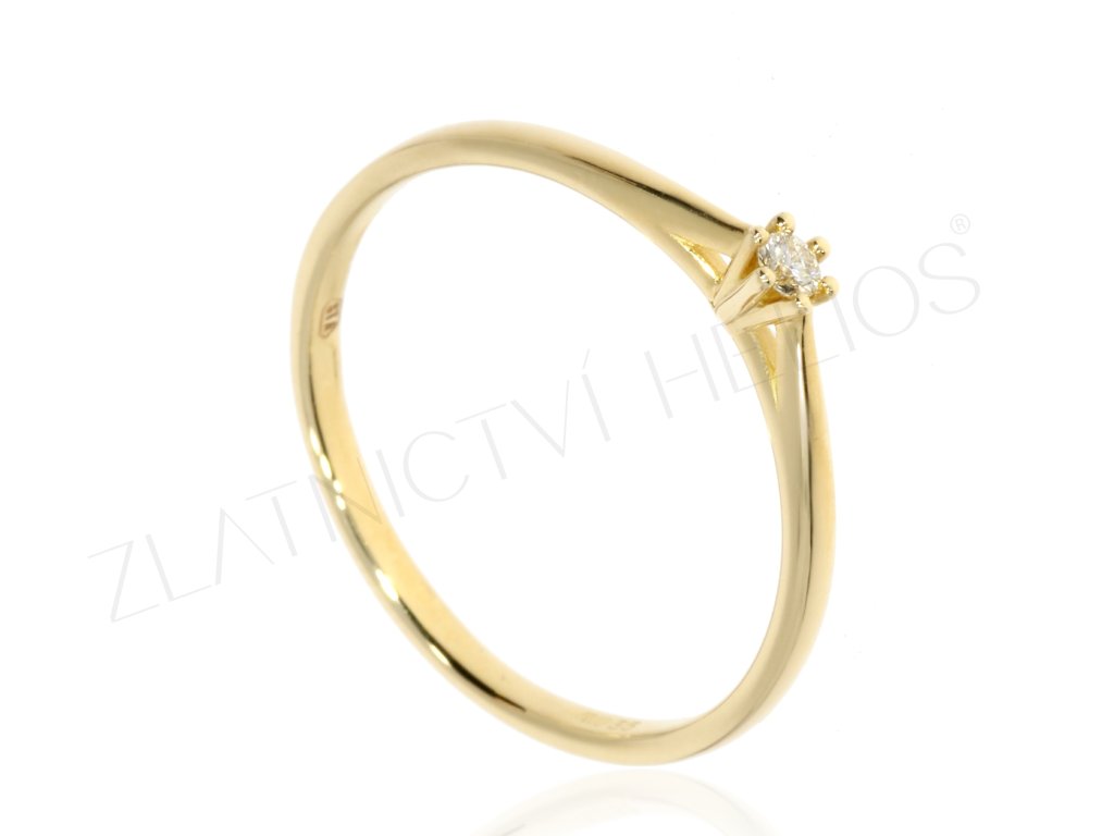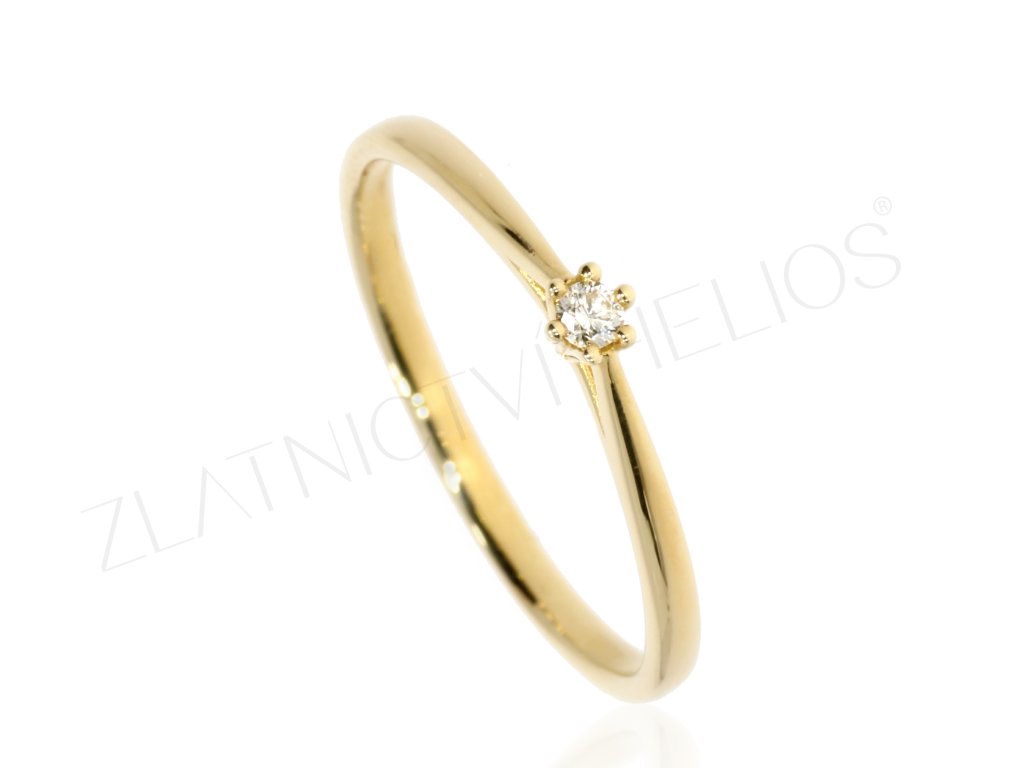 Něžný prsten ze žlutého zlata zdobený diamantem. Zásnubní prsten pro milovnice jemných šperků.