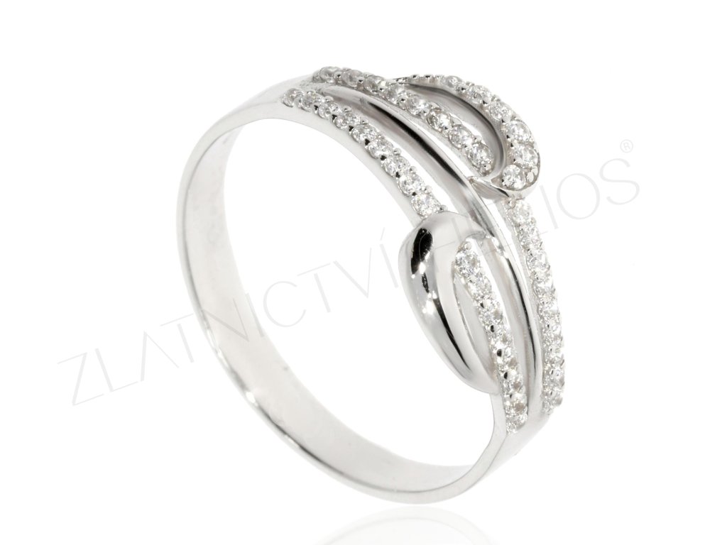 Prsten z bílého zlata upoutá třpytem zirkonů, které jsou vloženy ve dvou řadách a protíná je vlnka lesklá i zirkonová.
