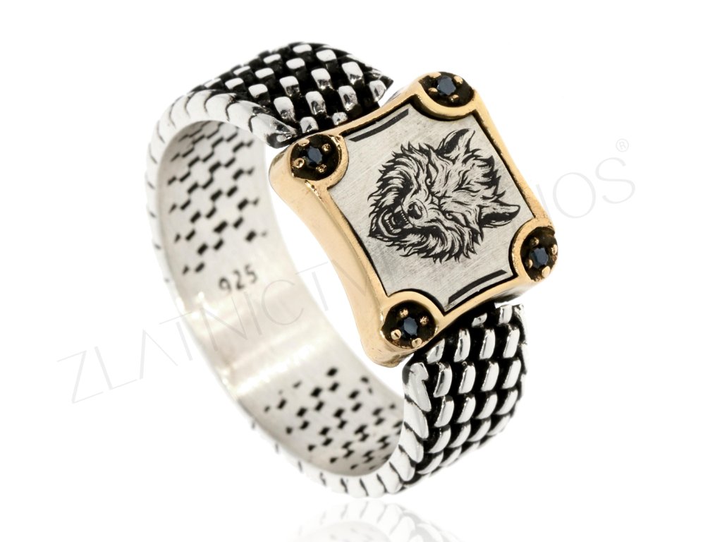 Stříbrný pánský prsten s vlkem. Efektně zdoben černými zirkony v rozích u zlacení.