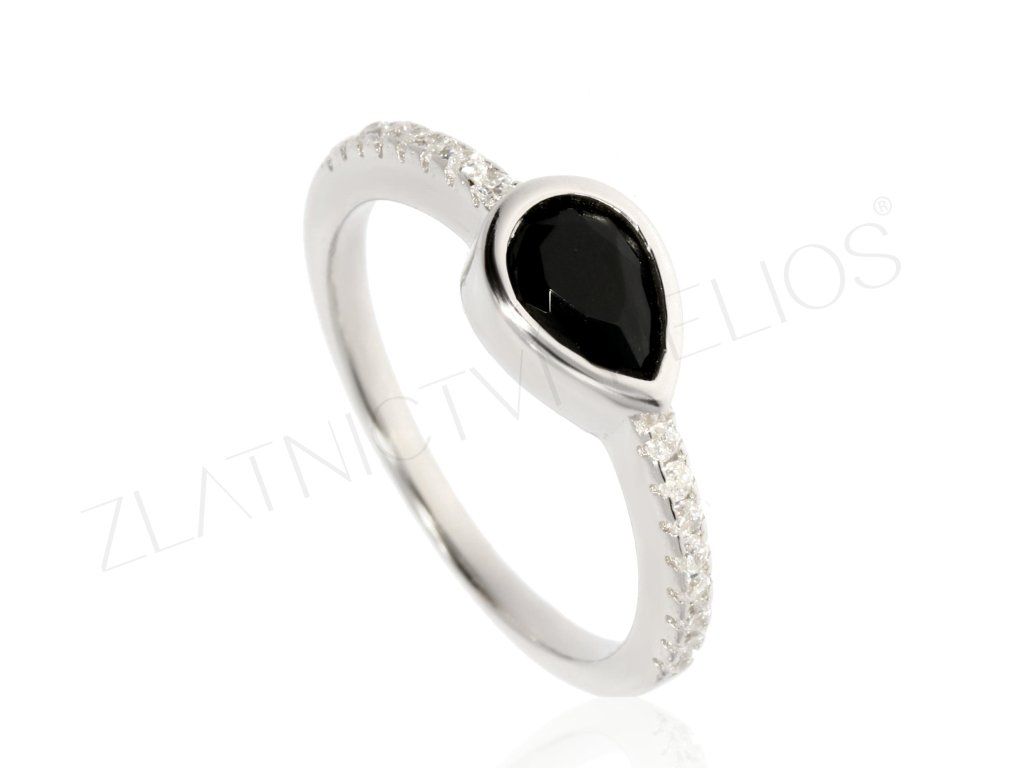 Stříbrný prsten zdobený černým centrálním zirkonem ve tvaru kapky.