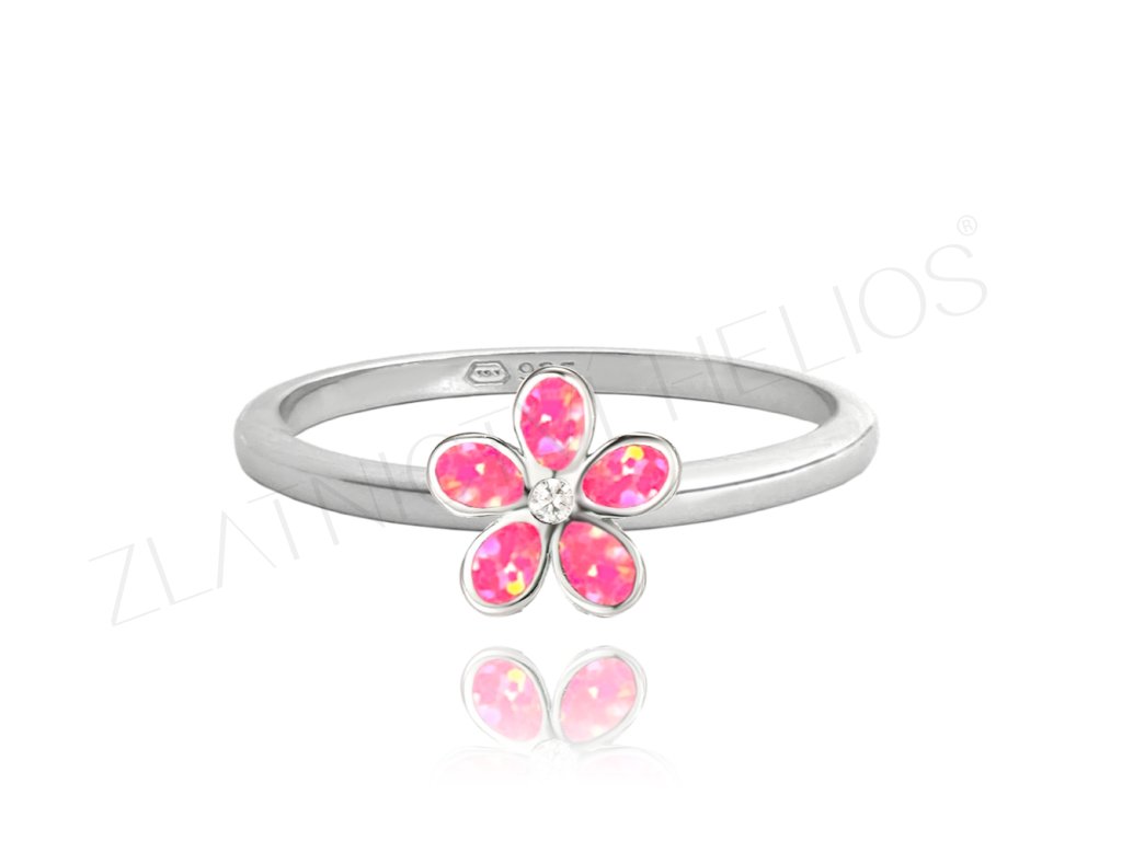 Prsten ze stříbra zdobený květinkou s lístky se syntetickým růžovým opálem. Velmi malá velikost- dětská.