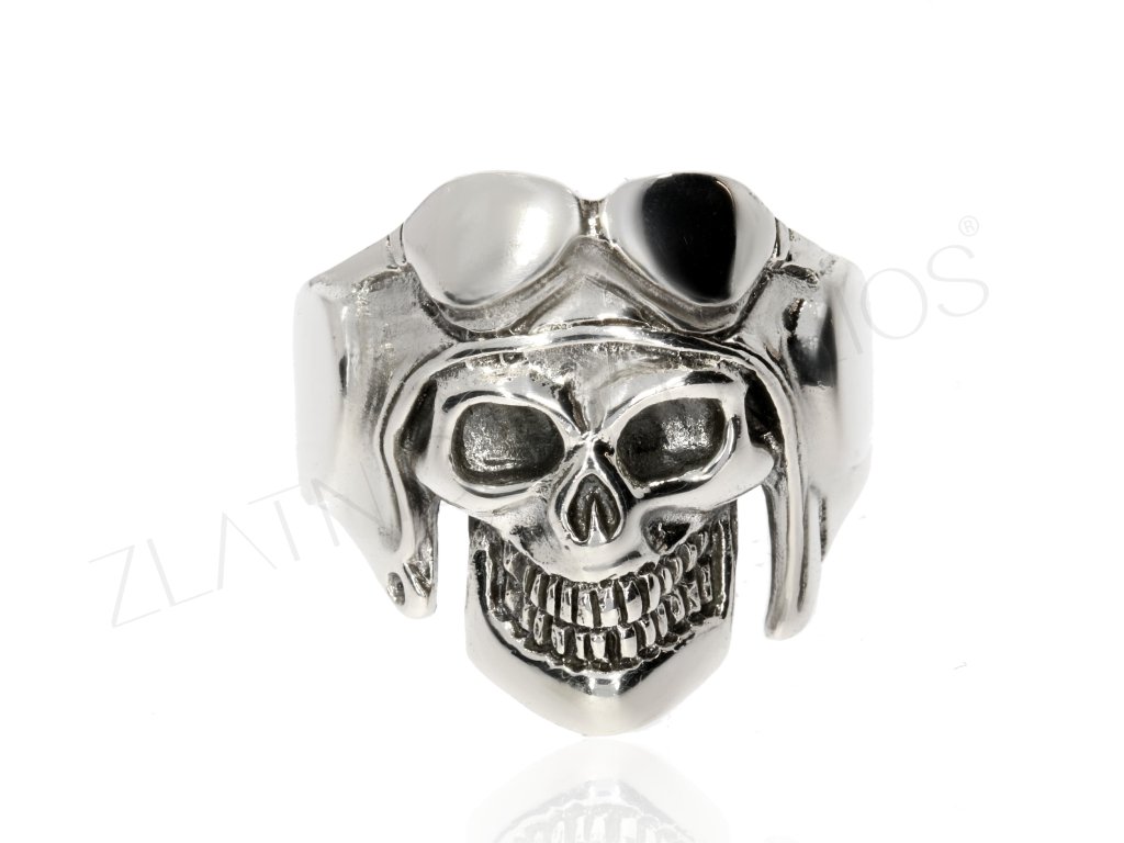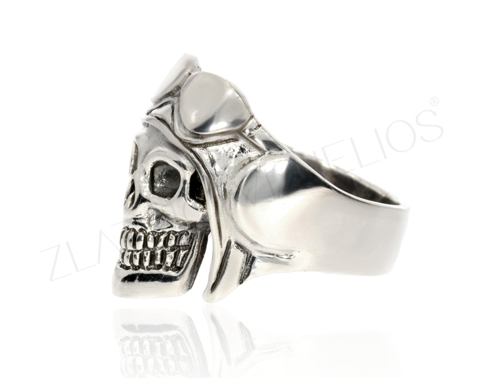 Lebka v letecké kukle s brýlemi- oblíbený maskot heavy metalové kapely. Prsten ze stříbra pro muže.