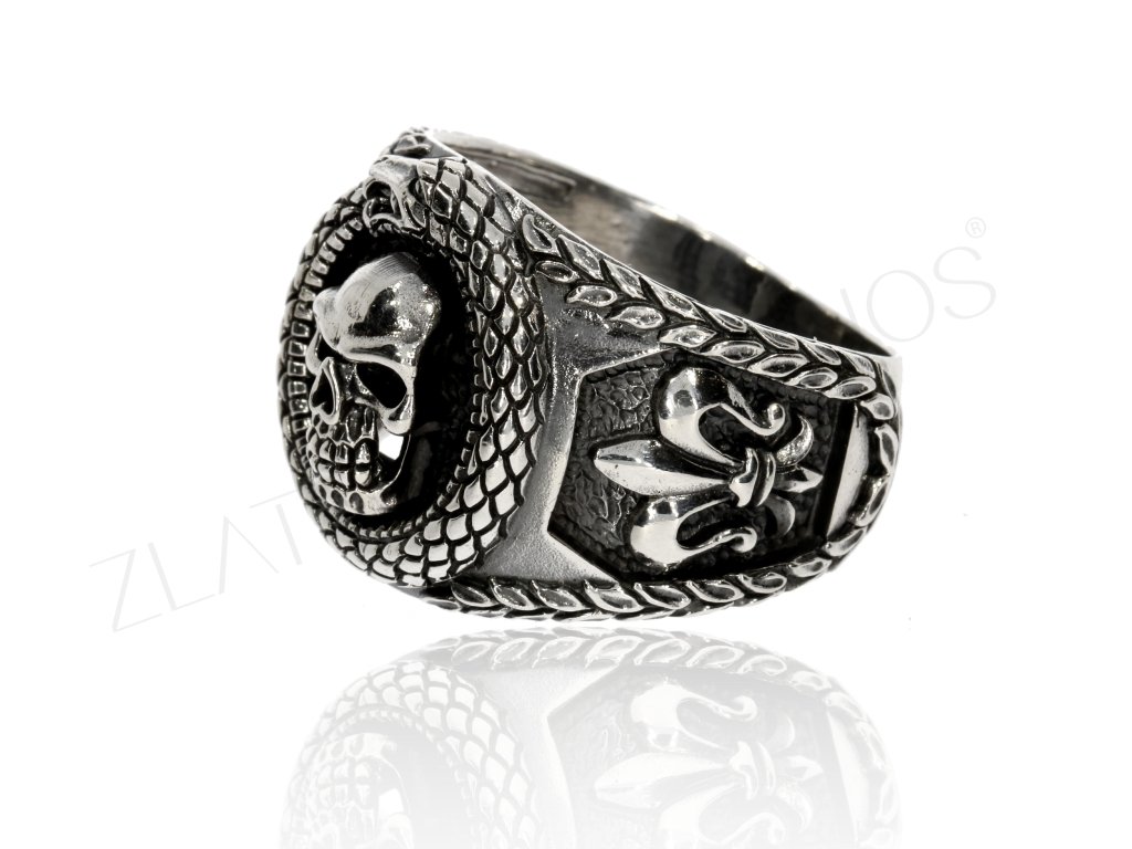 Pánský prsten ze stříbra, který je dozdoben lebkou v kruhu hada.
