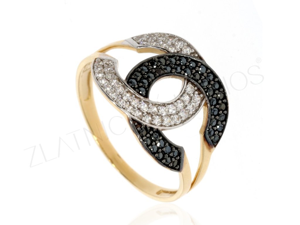 Zářivý prsten ze žlutého zlata zdobený černými zirkony. Extravagantní design tohoto prstýnku zaujme svým leskem a kombinací barev.