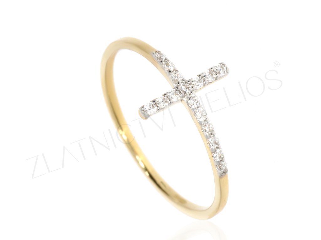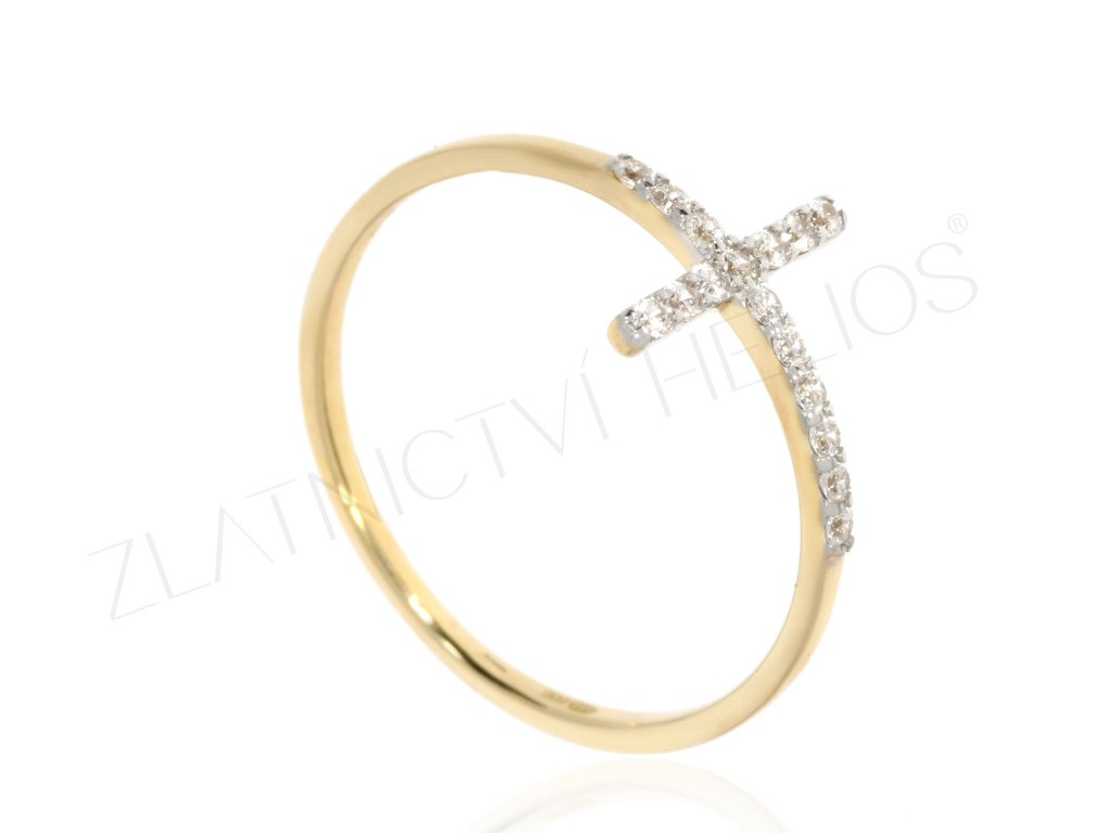 Design zlatý prsten s křížkem, který je posázený zirkony.