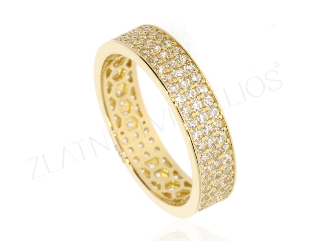 Prsten ze žlutého zlata bohatě posázený zirkony po celém obvodu.