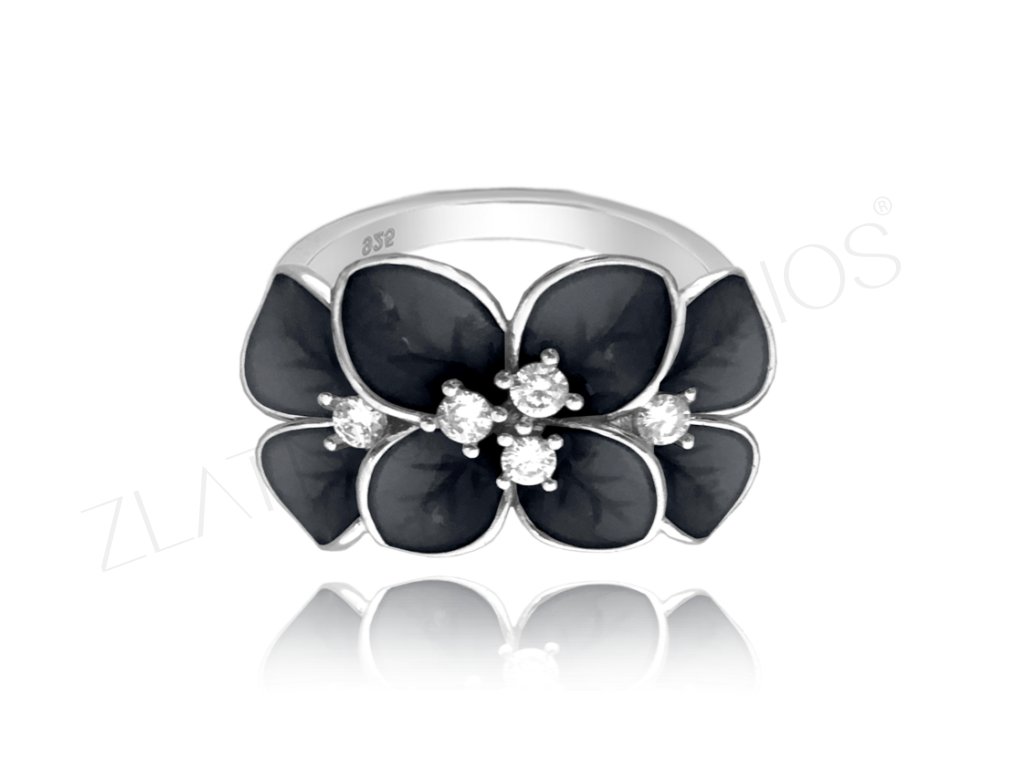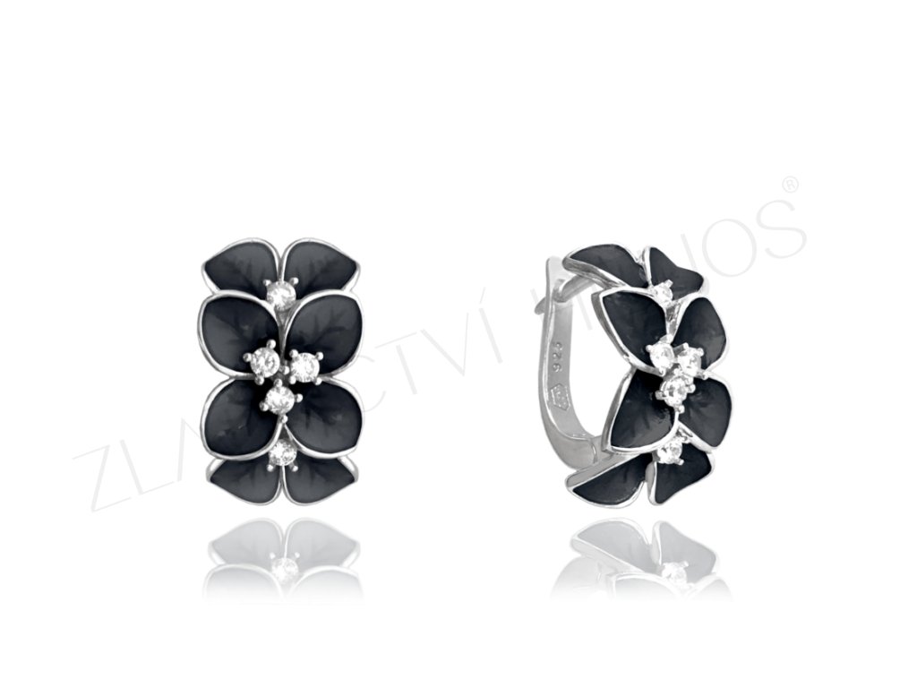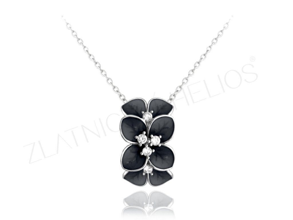Černý smalt dodává 3D efekt u tohoto přívěsku, který je zavěšen dvěma skobičkami ze zadní části stříbrného šperku na řetízku. Jednoduchý řetízek nechá vyniknout květinovému šperku.