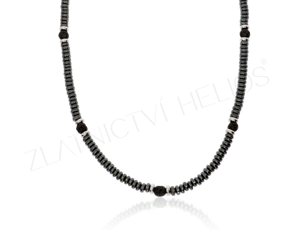 Hematitové části řetízku jsou odděleny kuličkami z lávového kamene a chirurgické oceli. Náhrdelník pro muže i ženy s nastavitelnou délkou v rozmezí 47-50cm.