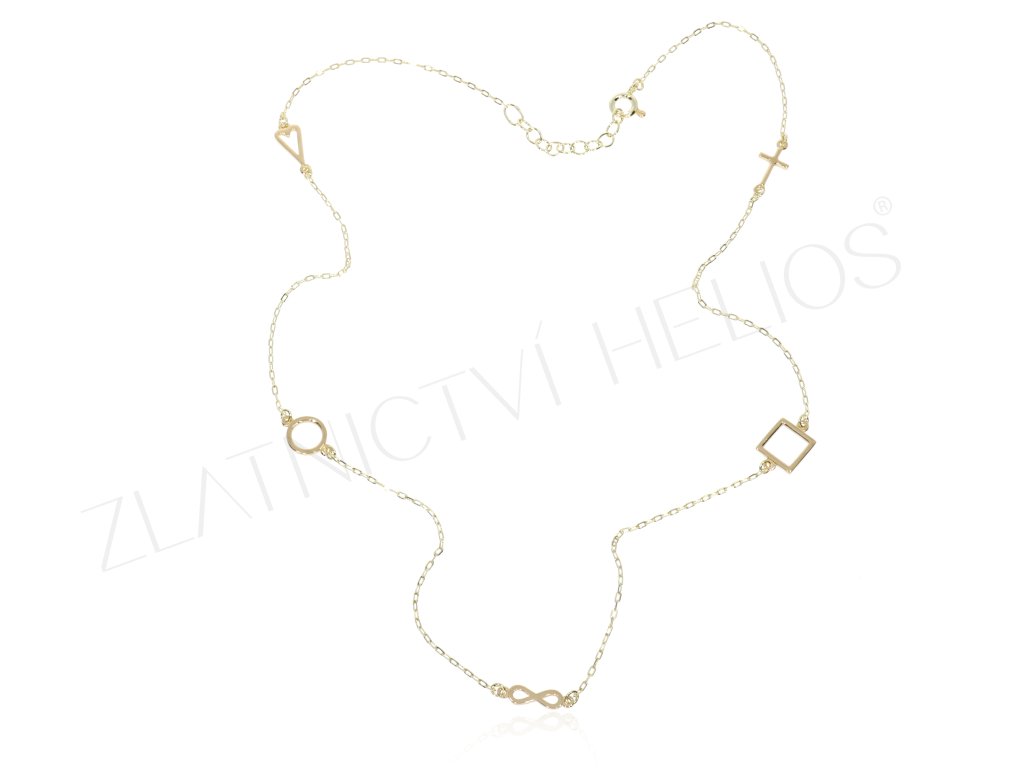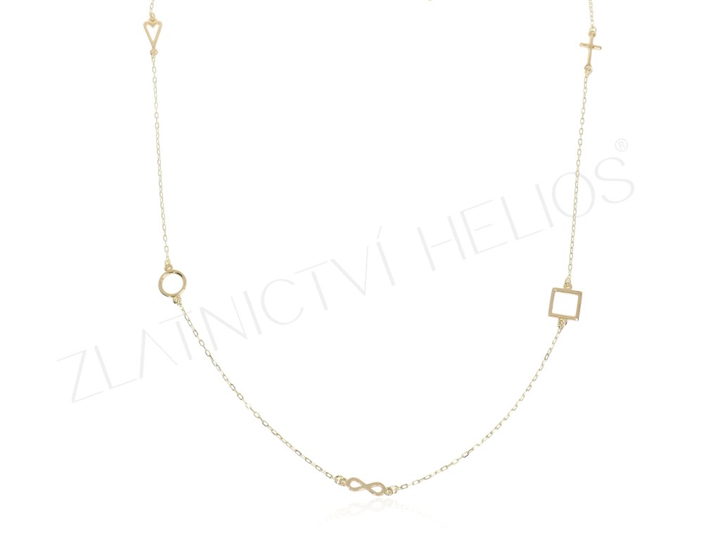 Náhrdelník ze žlutého zlata zdobený vsazenými symboly a geometrickými tvary. Srdce, křížek, nekonečno, čtvereček a kolečko.