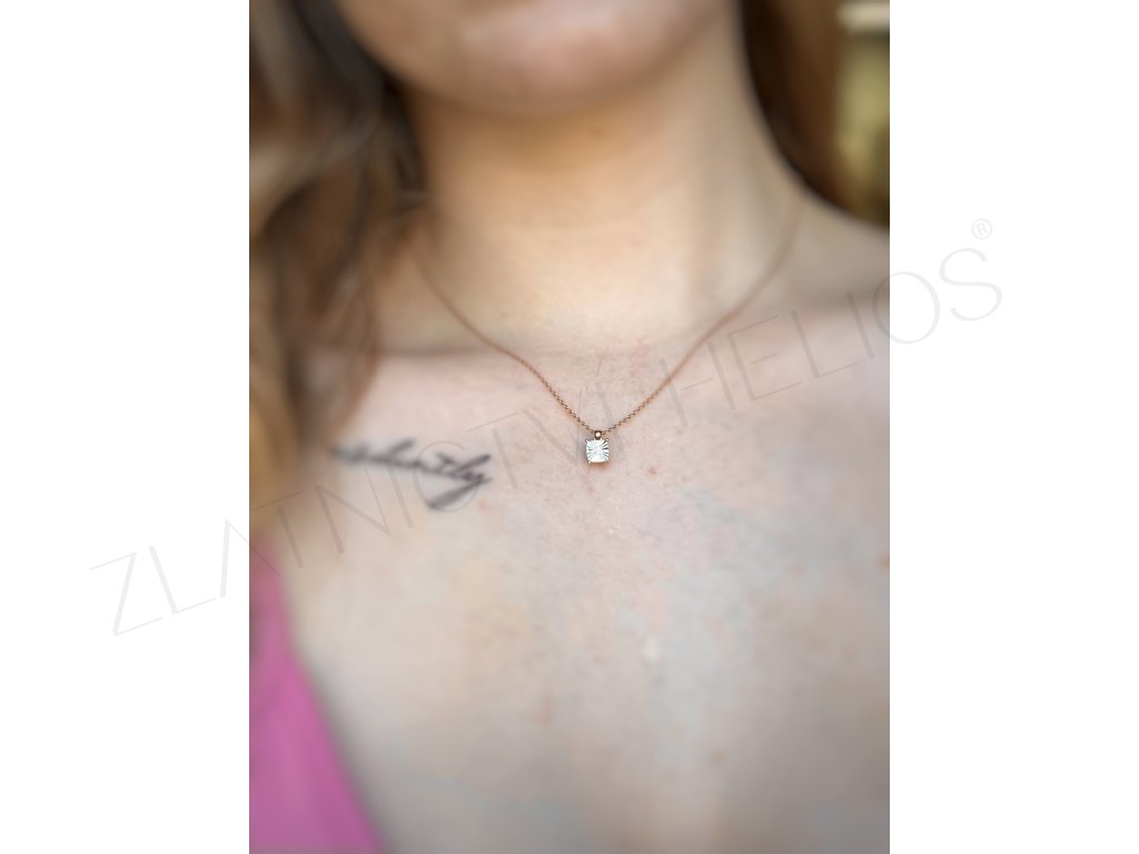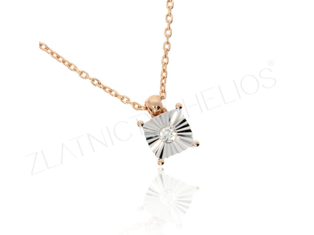 Náhrdelník z růžového zlata zdobený přívěskem ve tvaru čtverce s třpytivýma ploškama v jehož středu je vložen diamant.