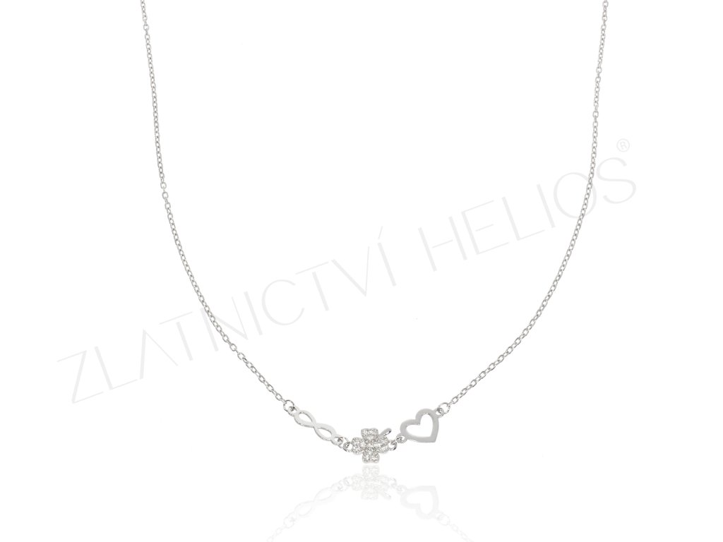 Stříbrný náhrdelník zdobený vloženými symboly. Srdíčko a nekonečno jsou v lesklém stříbrném provedení, čtyřlístek zase bohatě posázený zirkony.