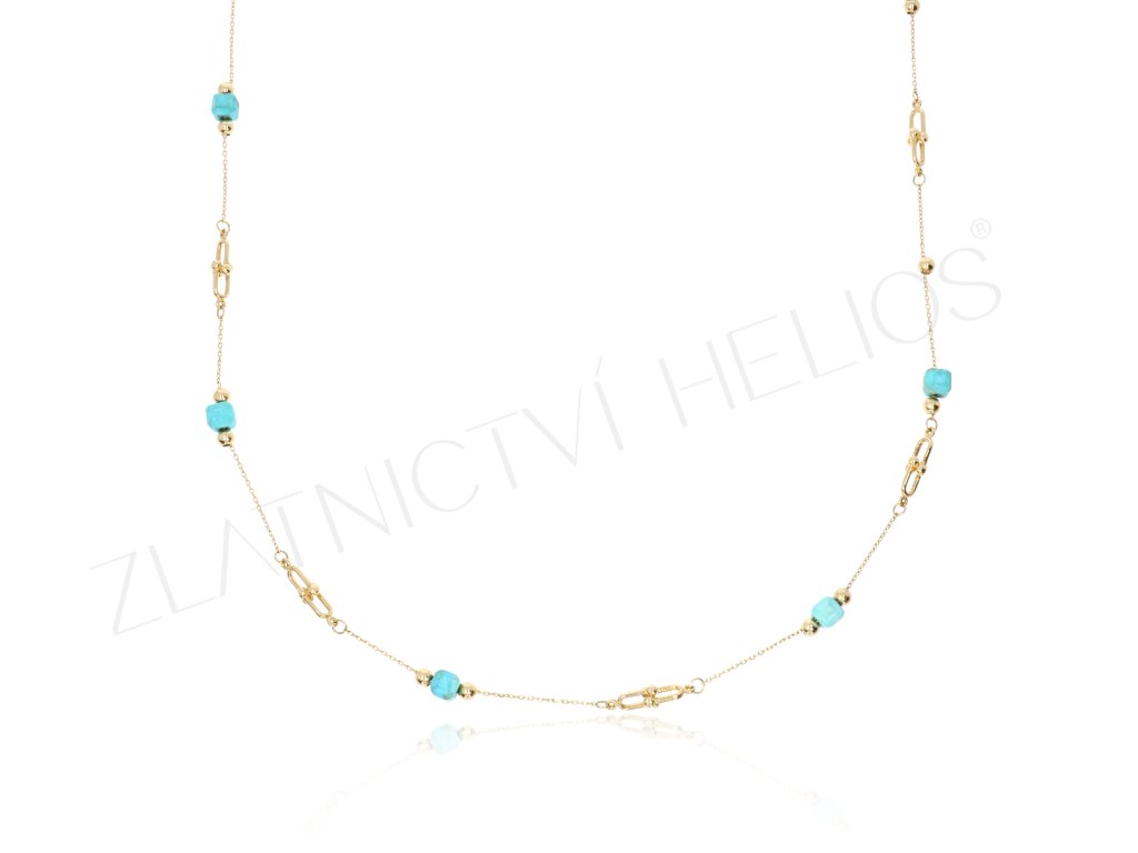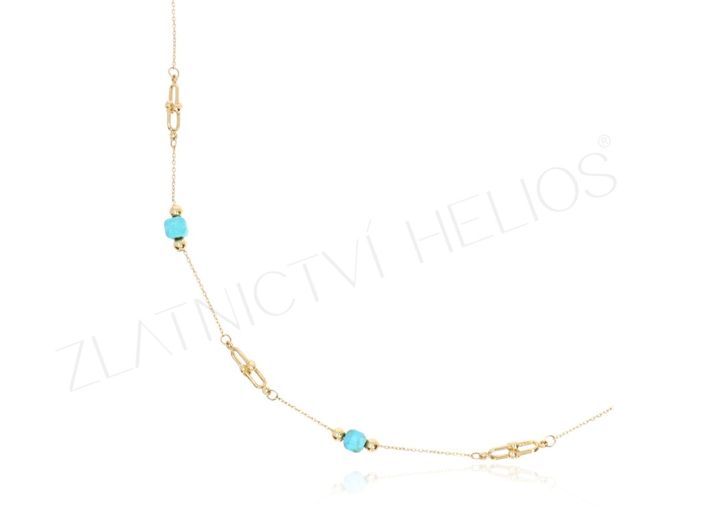 Zlatý náhrdelník, který je dozdoben korálky tyrkys. Dodává jedinečnost a jednoduchost šperku.