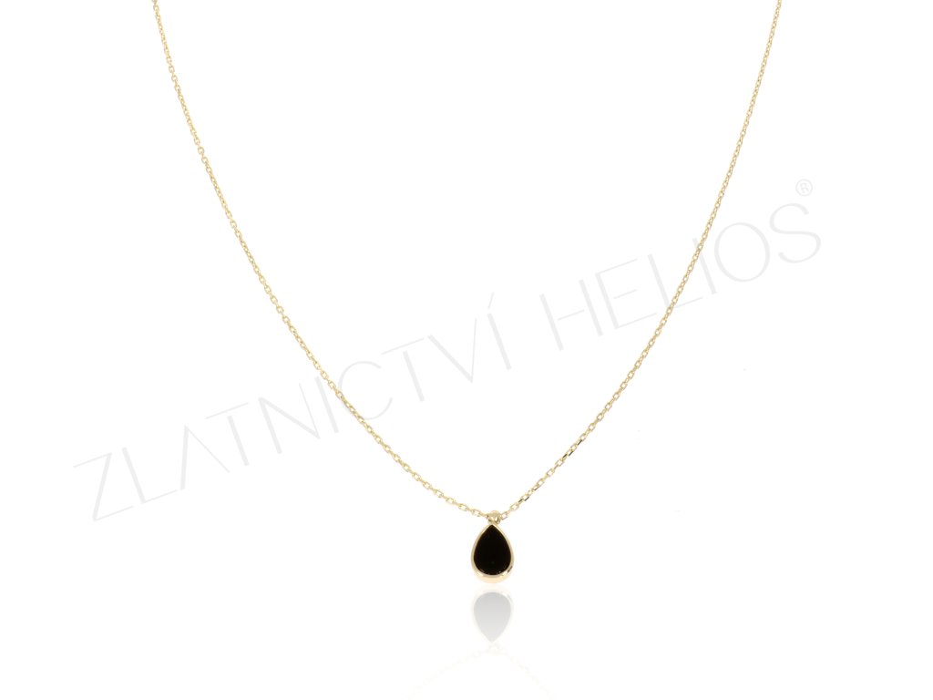 Náhrdelník ze žlutého zlata, který je ozdobený černou slzou. Ozdoba dodává šperku minimalistický a elegantní styl.