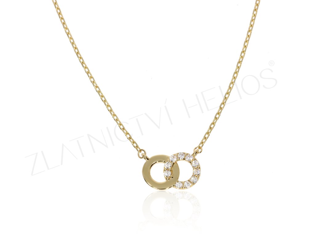 Náhrdelník ze žlutého zlata v minimalistickém stylu je zdobený drobnými kolečky, které jsou vloženy uprostřed. Větší kolečko je se zirkony.