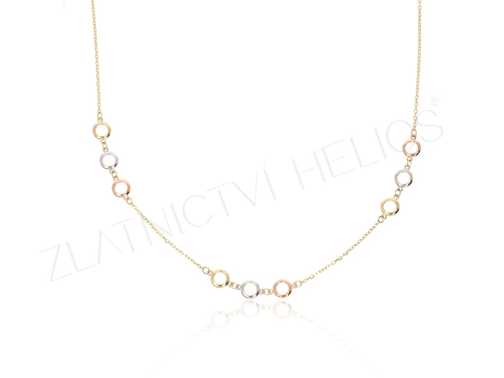 Droboučké kroužky ze žlutého, růžového a bílého zlata a tvoří tak náhrdelník z kombinovaného zlata. Délku náhrdelníku si můžete přizpůsobit v rozmezí 45-48cm. V naší nabídce najdete také náramek do soupravy.