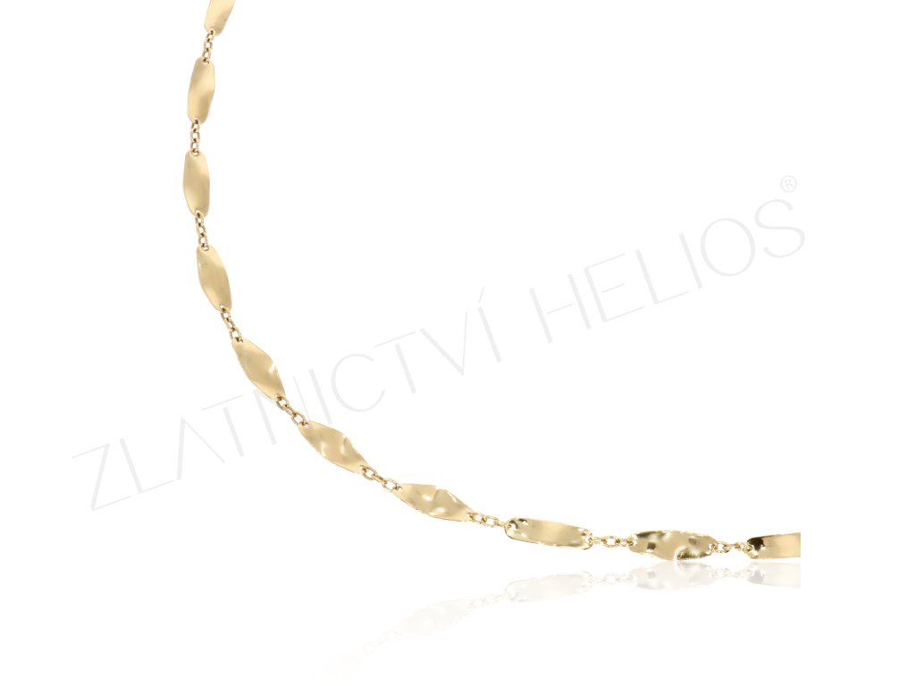 Zlatý řetízek složený z plochých lesklých mírně zatočených oček je možné doplnit také o náramek ve stejném provedení a vytvořit tak soupravu.