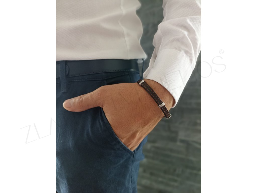 Náramok z chirurgickej oceleOceľová časť leskláKoža čierna, prešitá červenou niťouRozmery 21cmŠírka cca 10mm
